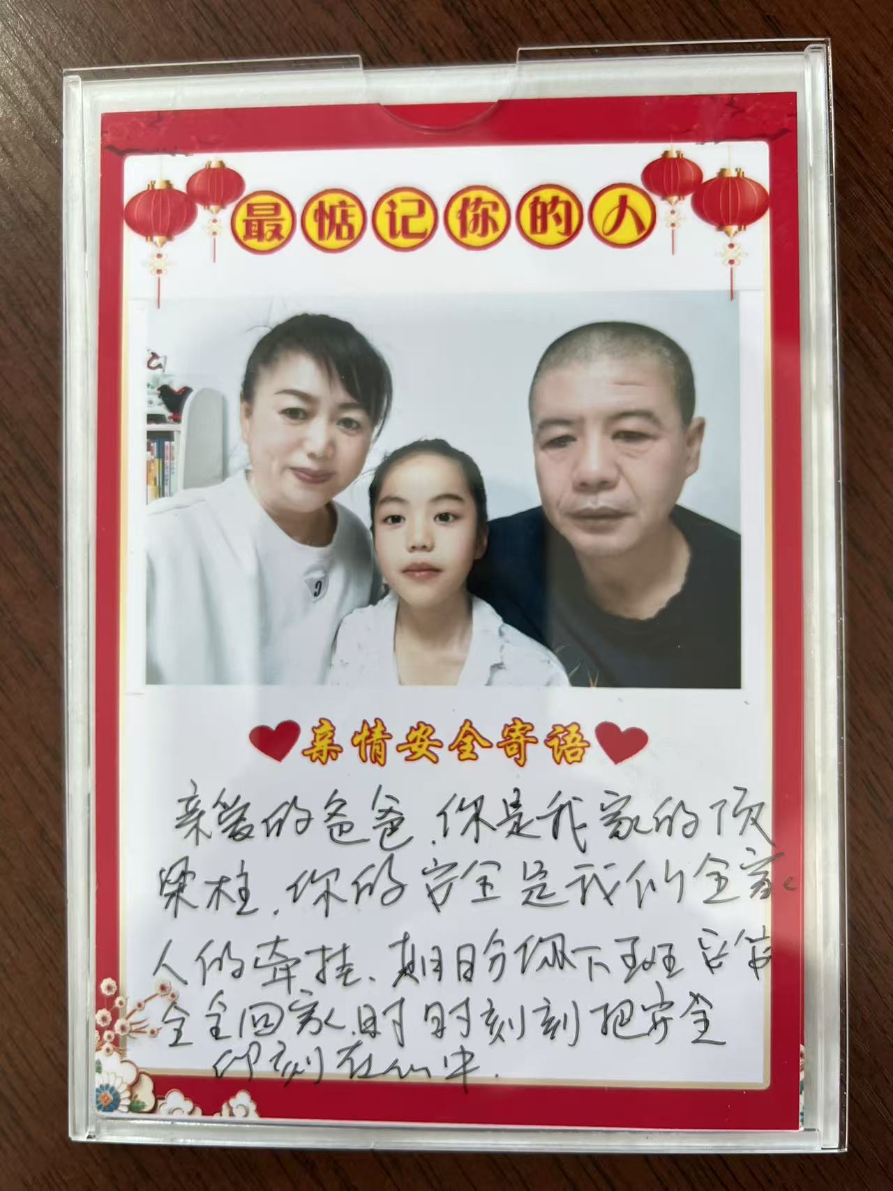 照片旁,贴着手写的寄语条:“老公,我做了你最爱吃的红烧肉,等你平安回来”“爸爸,井下千万小心,我和妈妈在家等你”“儿子,不要太辛苦,平安就是?!?。